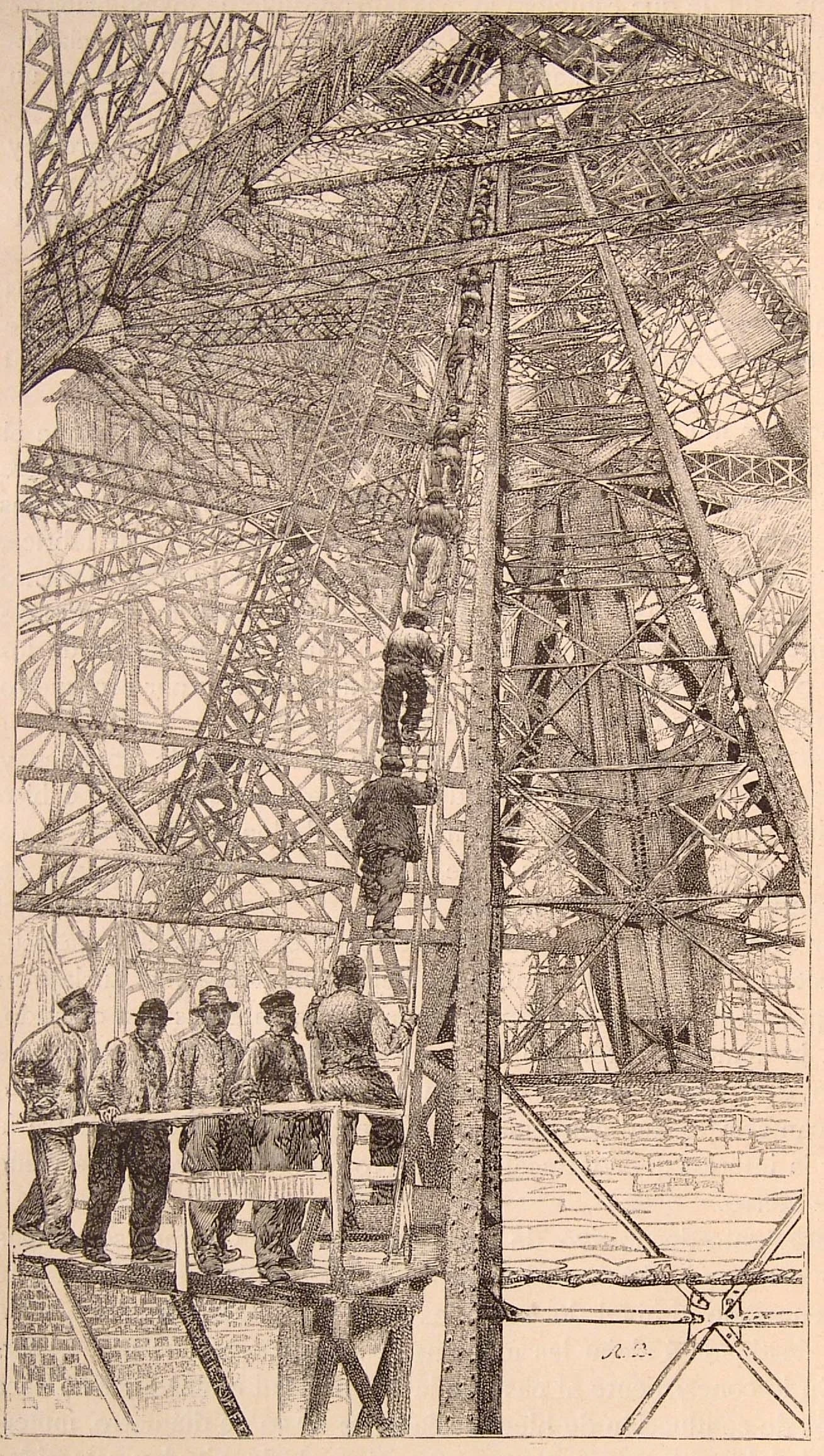Arbeiter bei der Arbeit / Illustration ausgewählt von Monsieur de France: Von Fondo Antiguo de la Biblioteca de la Universidad de Sevilla aus Sevilla, Spanien – Aufstieg der Arbeiter auf den Eiffelturm, CC BY 2.0, https://commons.wikimedia.org/w/index.php?curid=51646523