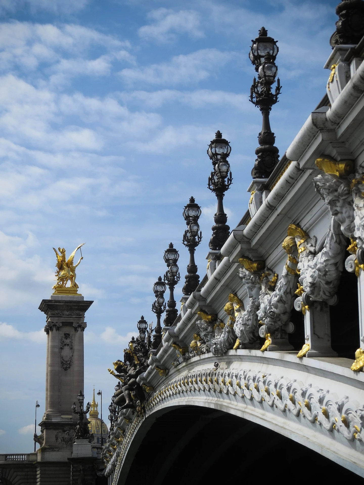 The Pont Alexandre III is famous for being one of the most ornate bridges in Paris. Built for the 1900 Universal Exhibition, it is known for its gilded statues, monumental pylons, Art Nouveau lamps, and rich sculptural decorations symbolizing arts, sciences, war, and peace.