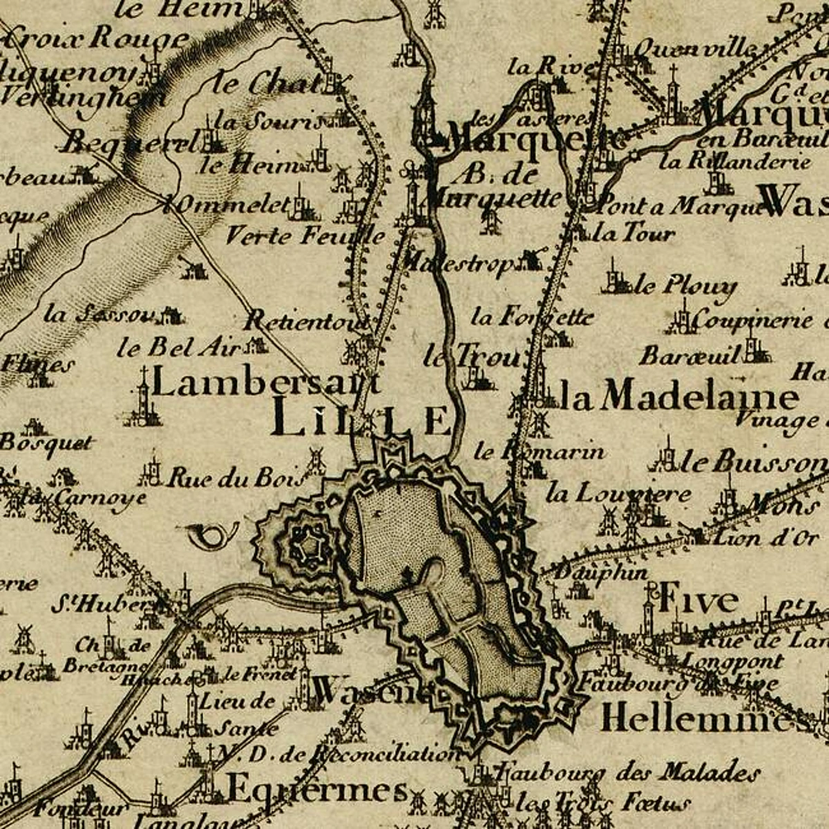 Carte des alentours de Lille Par Joseph de Ferraris (1726-1814) — http://teca.bncf.firenze.sbn.it/ImageViewer/servlet/ImageViewer?idr=BNCF0003497497, Domaine public, https://commons.wikimedia.org/w/index.php?curid=48265879