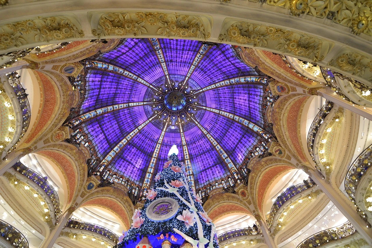 L'accès aux grands magasins est gratuit lui aussi. Ils sont souvent très beaux comme ici la coupole des galeries Lafayette / Photo choisie par Monsieur de France Image par Julia Casado de Pixabay
