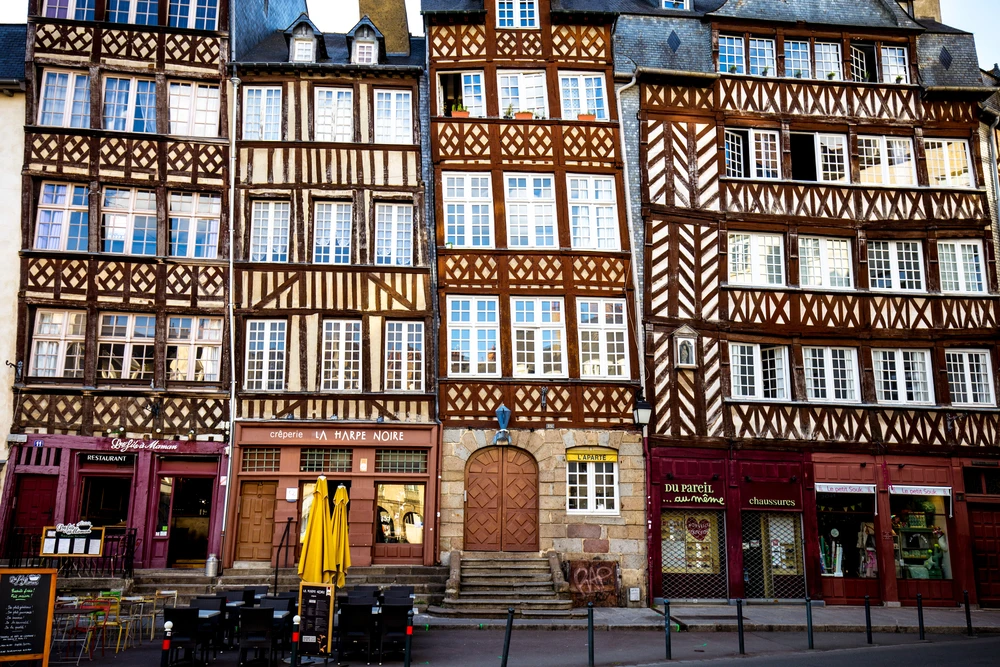 Enkele van de houten huizen werden niet verwoest door de grote brand van 1720, en zijn typerend voor het centrum en de thuisbasis van veel van de cafés en restaurants van Rennes / Foto door EQRoy/Shutterstock