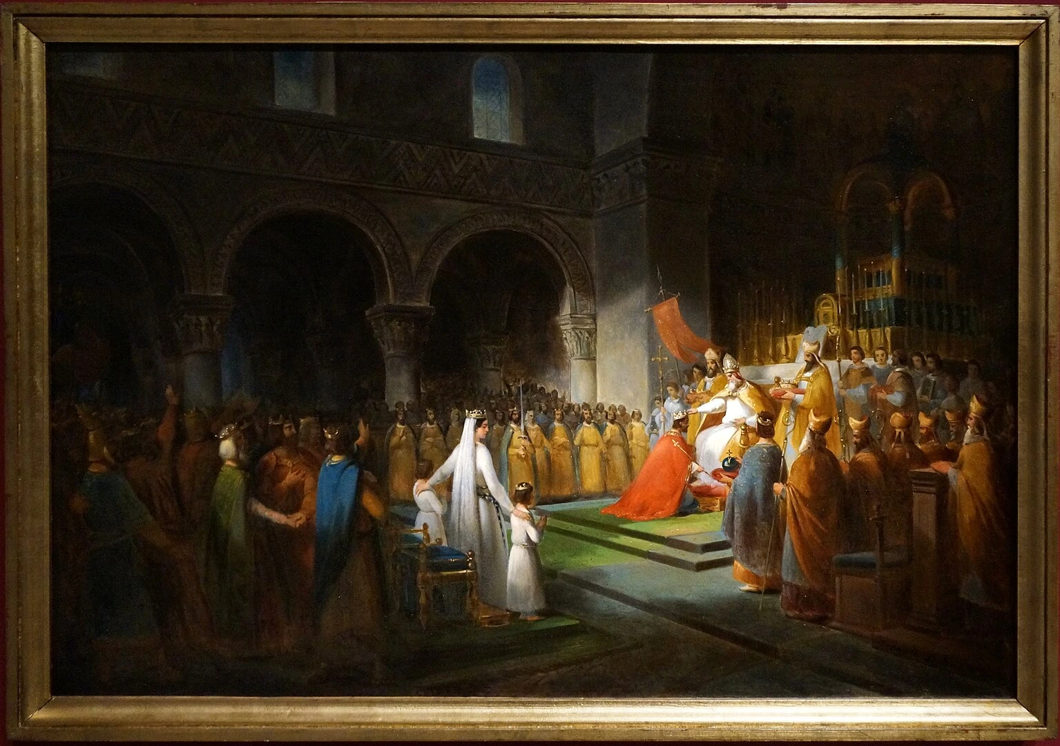 Kroning van Pepijn de Korte in Saint-Denis (olieverf op doek van François Dubois, 1837 / Afbeelding gekozen door Monsieur de France Door G. Garitan — Eigen werk, CC BY-SA 4.0, https://commons.wikimedia.org/w/index.php?curid=35561914