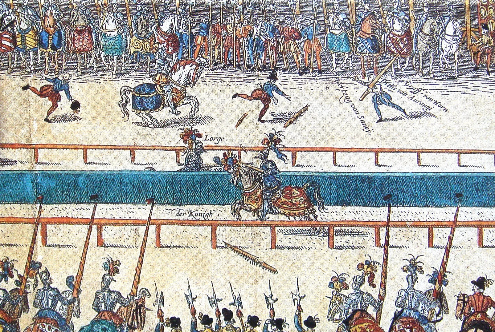 Het fatale toernooi bedacht in Duitsland / Door 16e-eeuwse Duitse prent, anoniem — "Catherine de Medicis en Henri III" Historia, Publiek domein, https://commons.wikimedia.org/w/index.php?curid=10347790