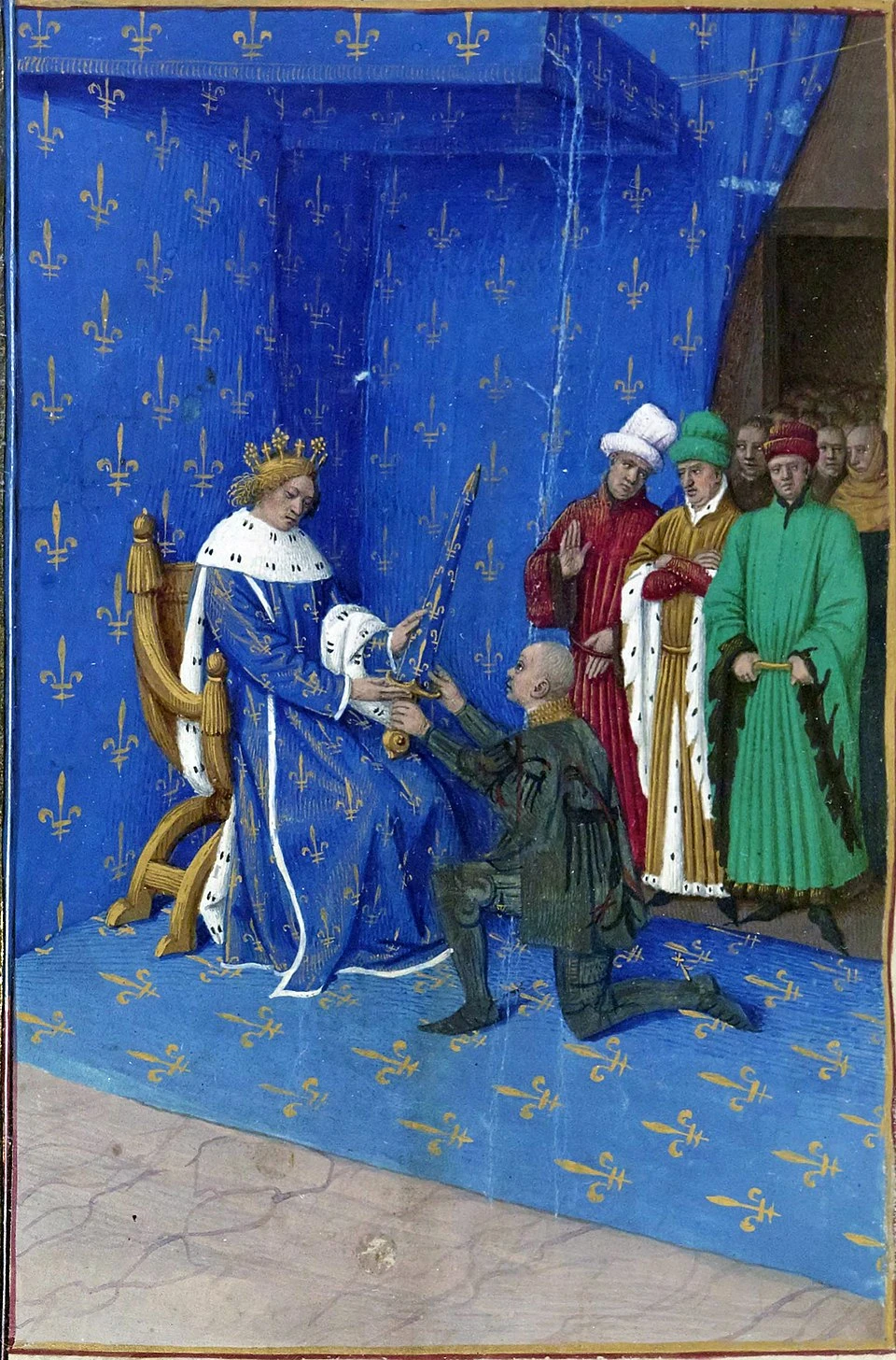Overhandiging van het zwaard van connétable aan Bertrand du Guesclin. Miniatuur uit de Grandes Chroniques de France, toegeschreven aan Jean Fouquet, circa 1455-1460, BnF, Fr.6465.